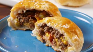 2. In center of each biscuit round, place 2 tablespoons cooked ground beef (or 1 meatball) and 1 cube of cheese. Wrap dough to completely enclose beef and cheese; pinch seams to seal.